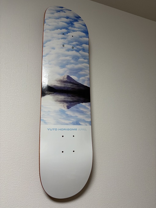木製のパーツを壁のフックに引っ掛けているだけなので、気分によって簡単に交換できるのがよい。(こちらはAprilの堀米モデル。パリ五輪で金取った時のデッキ)